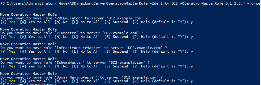 > Move-ADDirectoryServerOperationMasterRole -Identity DC2 -OperationMasterRole 0,1,2,3,4 -force